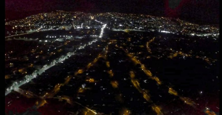 Em destaque na imagem a Av. Vereador Antônio da Costa Rios a noite. Ao fundo da foto, é possível ver a Catedral Metropolitana de Pouso Alegre bem pequenininha reluzindo o dourado de sua iluminação noturna.