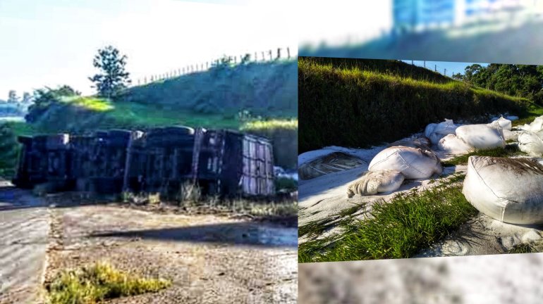 No fim da manhã deste domingo (28) no sentido Pouso Alegre da Fernão Dias em Estiva uma carreta tombou e a carga ficou espalhada.