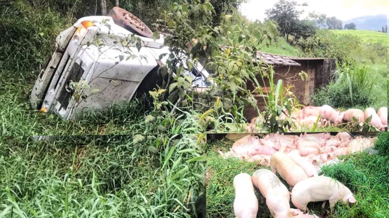 Um caminhão que vinha de Andradas, carregado com suínos vivos para descarregar aqui em Pouso Alegre, tombou em uma curva da BR-459 em Congonhal. Segundo as primeiras informações, alguma peça mecânica, provavelmente a mola, quebrou e o veículo tombou na sequência.