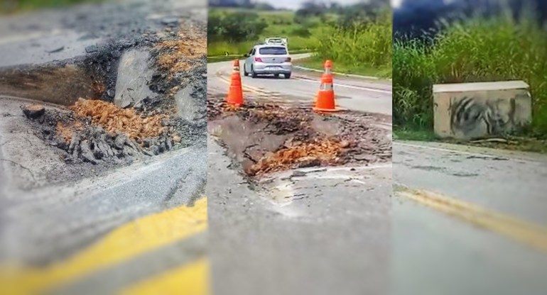 Ninguém ficou ferido e nenhum carro foi atingido. O trecho foi sinalizado com cones. Neste domingo, uma viatura da Polícia Militar de Paraguaçu foi até o local para dar apoio na sinalização. A previsão é que o asfalto receba reparos até segunda-feira (6).