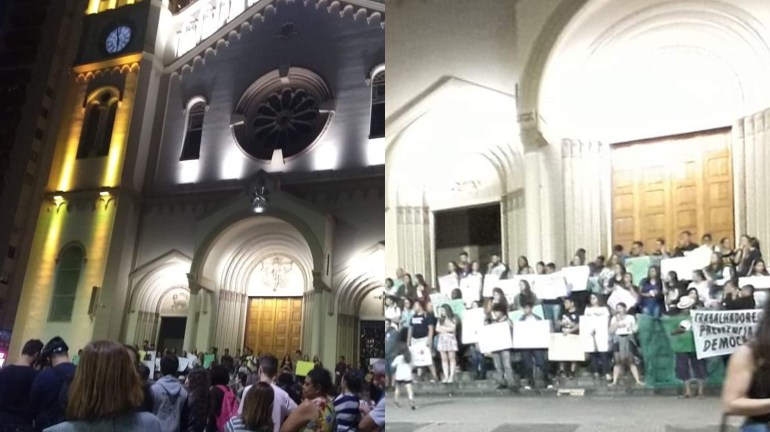 Os manifestantes em Pouso Alegre, fizeram discursos e gritos de protesto em um carro de som bem em frente a Catedral Metropolitana na Praça Senador José Bento, exibiam faixas e cartazes com frases sobre os ‘cortes’ na educação e contra a Reforma da Previdência.