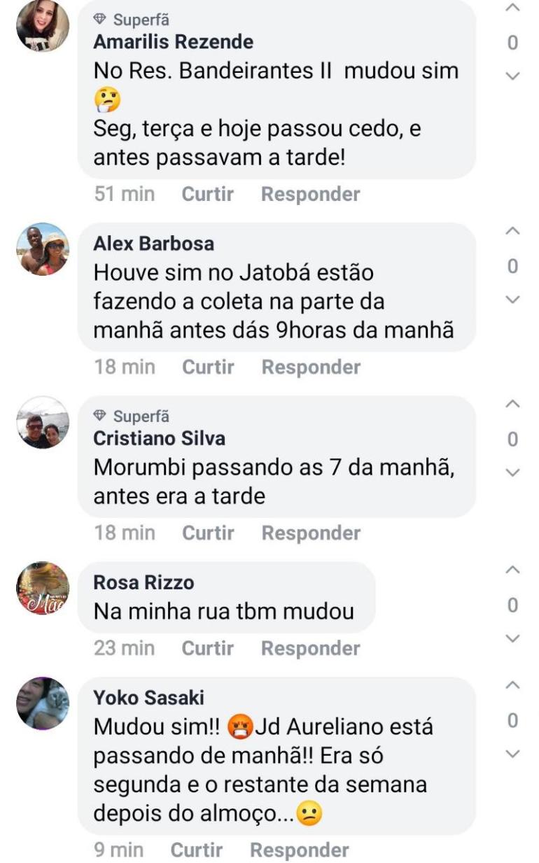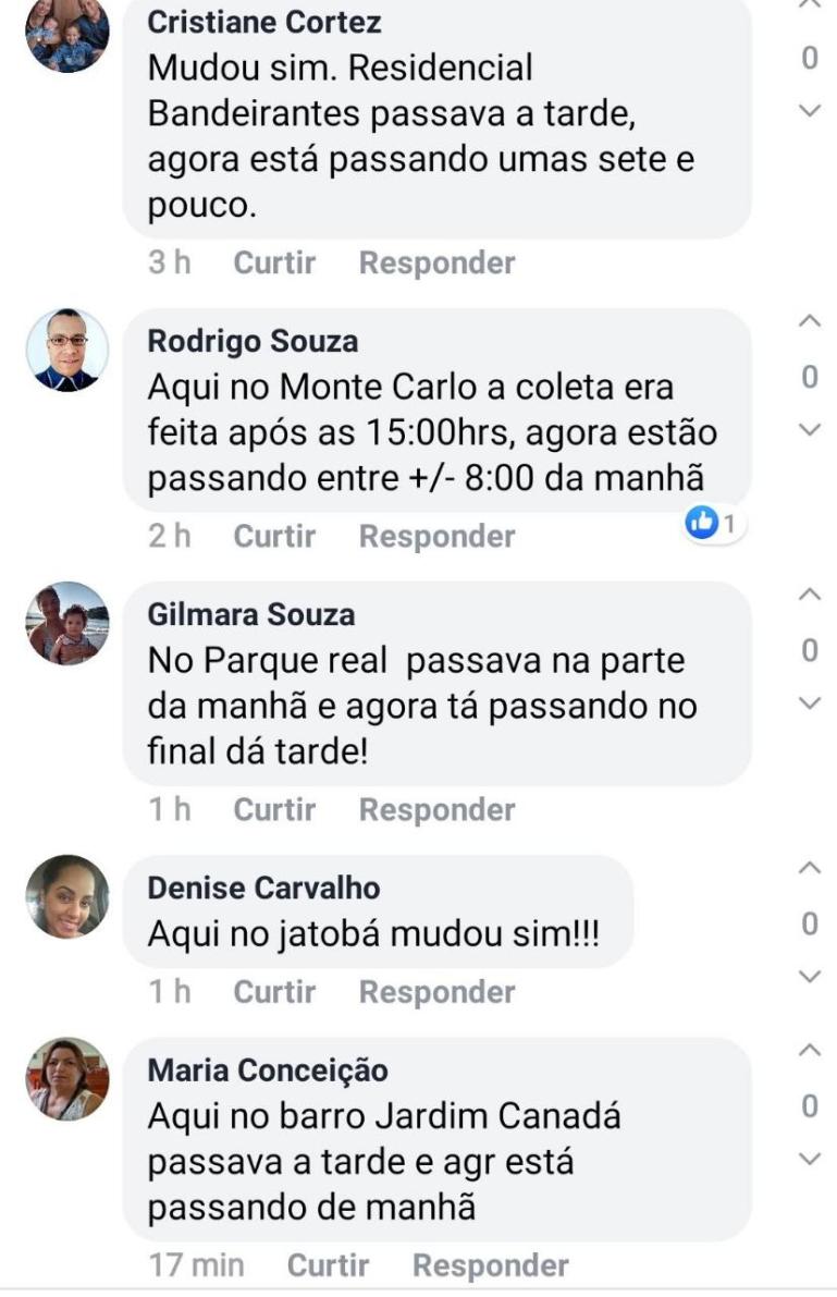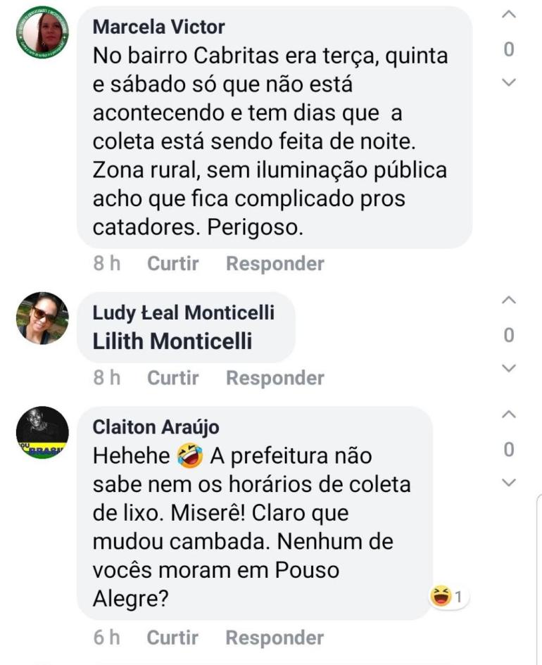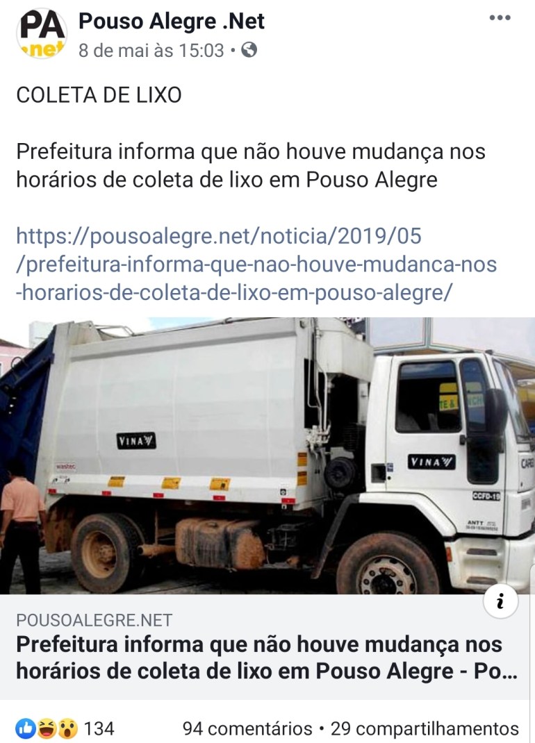 Na última semana aqui em Pouso Alegre, foi noticiado por uma página nas redes sociais, que apoia politicamente a atual gestão municipal intitulada Pouso Alegre . Net, de que a Prefeitura informava não ter havido mudanças nos horários de coleta de lixo em Pouso Alegre, mesmo grande parte da população Pouso-Alegrense, reclamando das alterações.