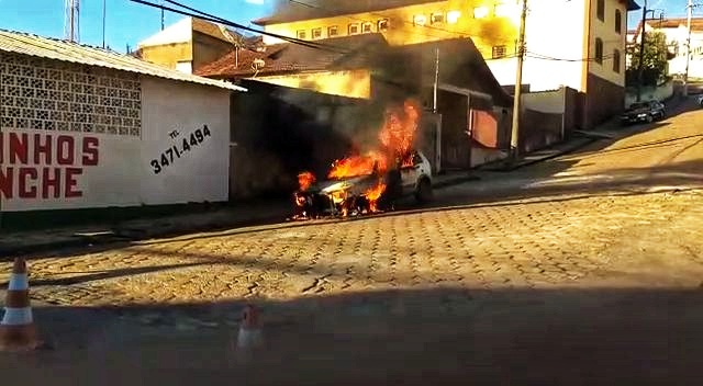 Um carro pegou fogo na manhã desta quinta-feira (16) em Santa Rita do Sapucaí.