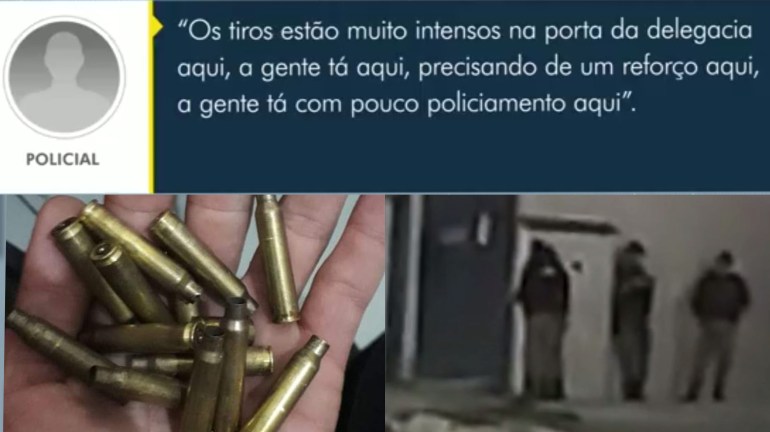 “Os tiros estão muito intensos na porta da delegacia aqui. A gente está aqui precisando de um reforço aqui, a gente está com pouco policiamento aqui”, disse um policial.