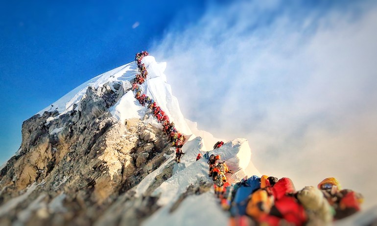 O bom tempo nos Himalaias provocou um congestionamento na última perna da escalada do Everest: uma fila com quase 300 pessoas aguardava a sua vez para chegar ao topo da montanha.