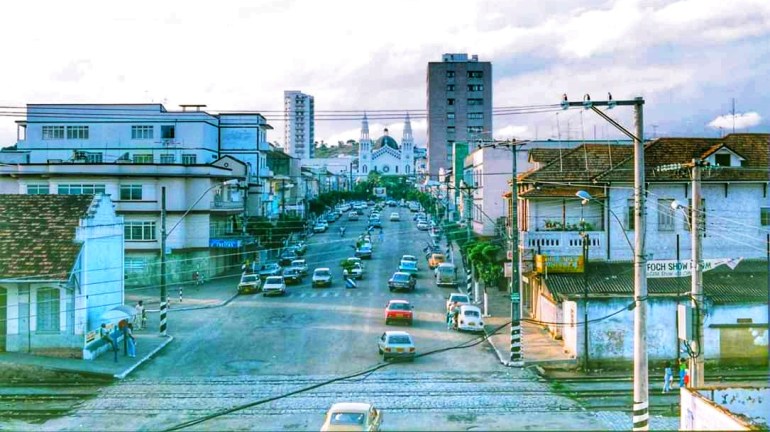 Veja como era a Av. Dr. Lisboa no centro de Pouso Alegre antigamente. Ao fundo da imagem, destaque para a Catedral Metropolitana.
