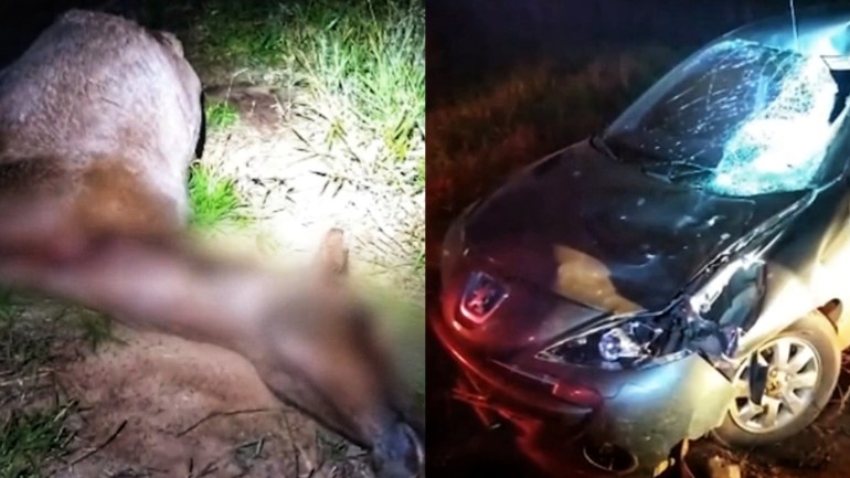 Segundo o boletim de ocorrência, o motorista, de 56 anos, contou que “deu de cara” com o animal na pista e não conseguiu evitar o acidente.