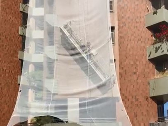 O andaime ficou dependurado. A sorte é que os funcionários estavam usando os equipamentos de proteção individual.